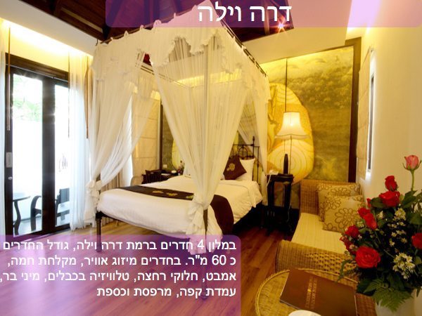 • במלון 4 חדרים ברמת דרה וילה, גודל החדרים כ 60 מ"ר. בחדרים מיזוג אוויר, מקלחת חמה, אמבט, חלוקי רחצה, טלוויזיה בכבלים, מיני בר, עמדת קפה, מרפסת וכספת