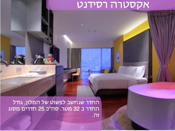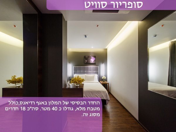 סוויטה משודרגת הכוללת מטבח מלא, גודלו כ50 מטר. סה"כ 22 חדרים מסוג זה.