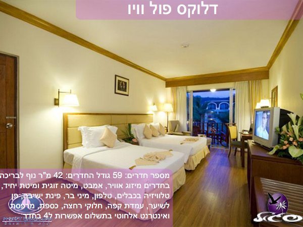 מספר חדרים: 59 גודל החדרים: 42 מ"ר נוף לבריכה בחדרים מיזוג אוויר, אמבט, מיטה זוגית ומיטת יחיד, טלוויזיה בכבלים, טלפון, מיני בר, פינת ישיבה, פן לשיער, עמדת קפה, חלוקי רחצה, כספת, מרפסת ואינטרנט אלחוטי בתשלום אפשרות ל4 בחדר