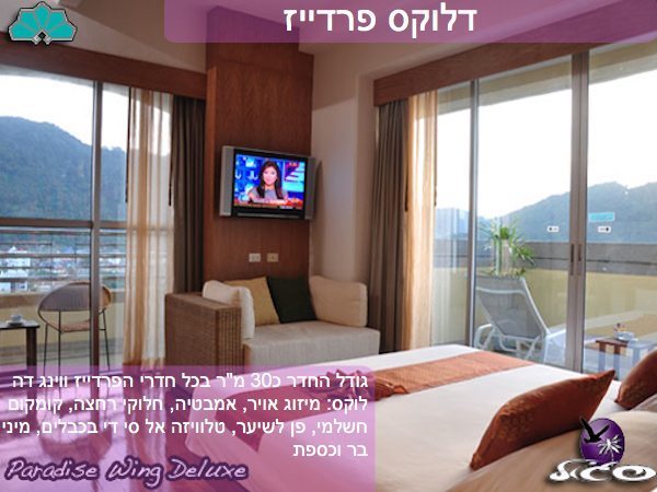 גודל החדר כ30 מ"ר בכל חדרי הפרדייז ווינג דה לוקס: מיזוג אויר, אמבטיה, חלוקי רחצה, קומקום חשלמי, פן לשיער, טלוויזה אל סי די בכבלים, מיני בר וכספת