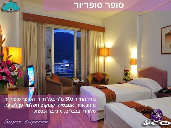 גודל החדר כ30 מ"ר בכל חדרי הסופר סופיריור: מיזוג אויר, אמבטיה, קומקום חשלמי, פן לשיער, טלוויזה בכבלים, מיני בר וכספת